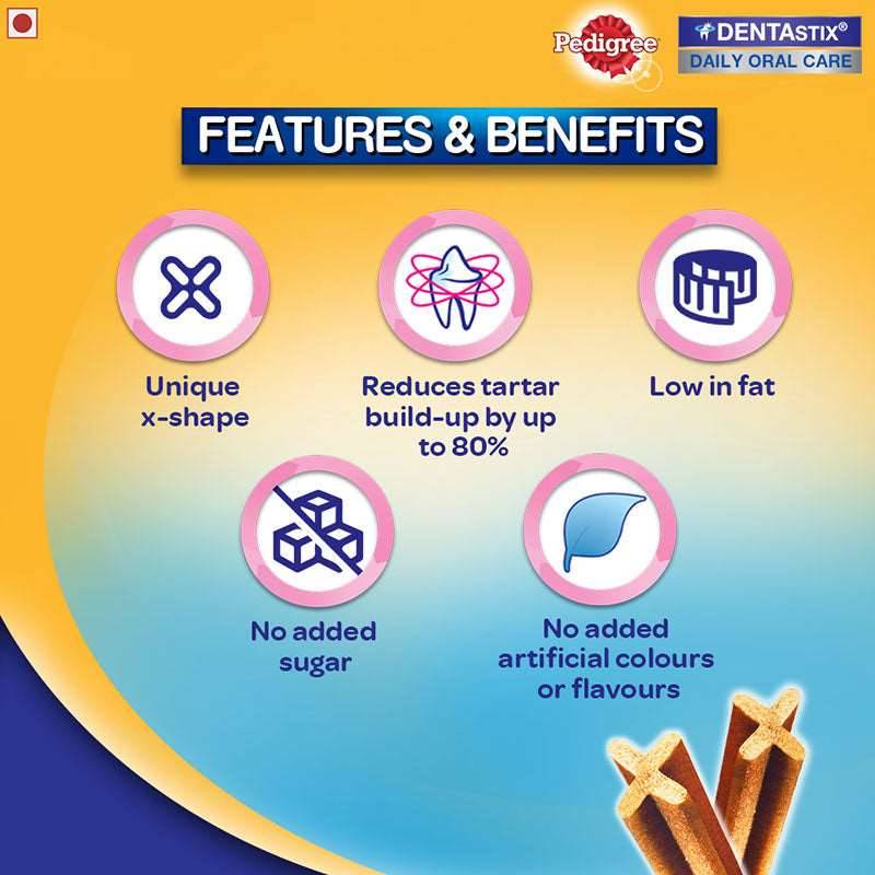 The unique x-shape and abrasive texture of Dentastix aids cleaning between teeth and down to the gum line, when fed daily as part of an oral care routine similar to humans. Pedigree Dentastix is completely digestible and has no residue, so it can be served as a tasty dog treat with actual dental benefits.